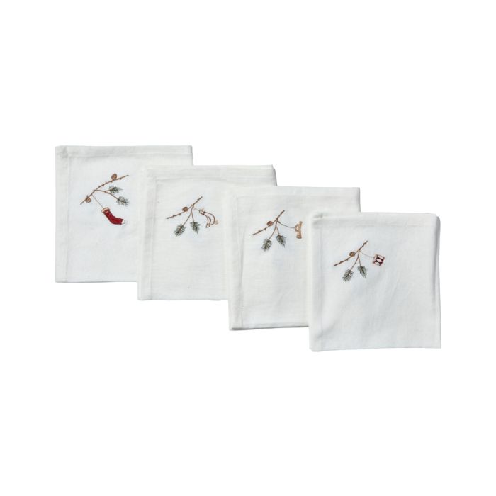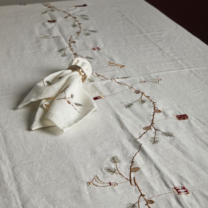 White cloth napkins with an embroidered fir branch with a cone and a Christmas motif. The napkins are a practical and decorative element in the table setting. The cloth napkins are from Speedtsberg's series of Christmas tablecloths, table runners and Christmas napkins.