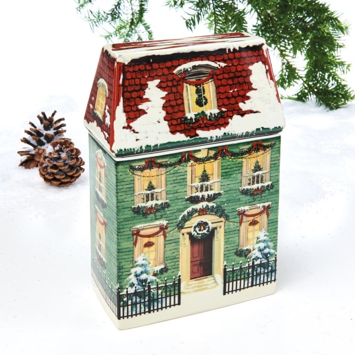 Nice ceramic cookie tin for storing Christmas cookies, for example. Decoratively shaped like a Christmas-decorated house.