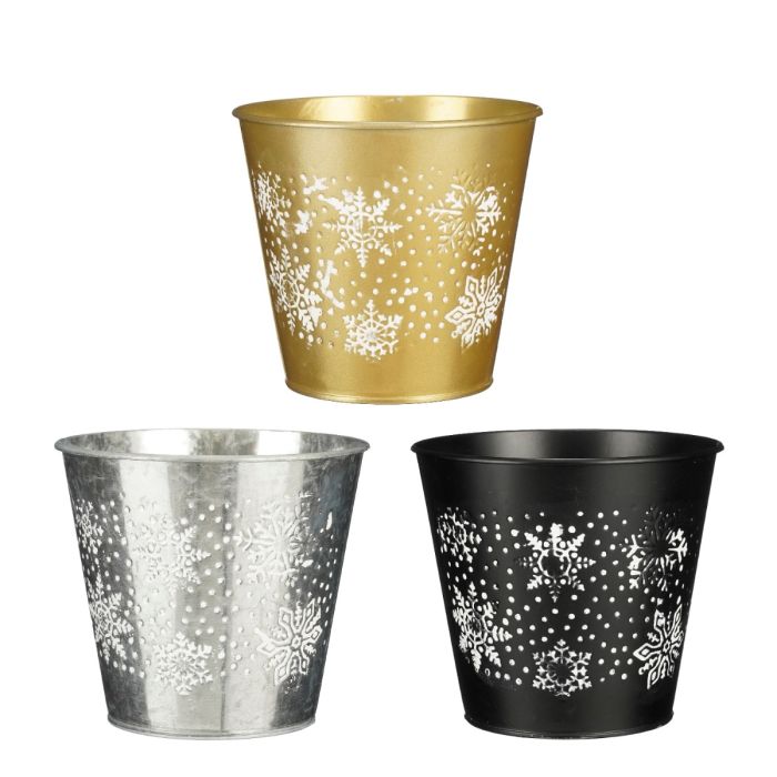 Cozy flower pot covers from Mica Decorations. They are made in three classic colors; black, gold and silver and decorated with a fine white snowflake pattern that gives a wintery look. The flower pot cover is perfect for smaller potted plants, but can also be used as a decorative container for Christmas branches, block candles, artificial Christmas trees or Christmas decorations.