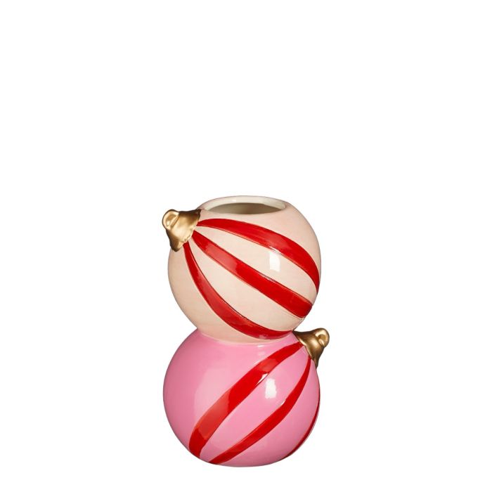 Two Christmas baubles are stacked on top of each other to form a whimsical vase. The vase is in shades of pink with red stripes. Candlesticks are also available in the same series.
