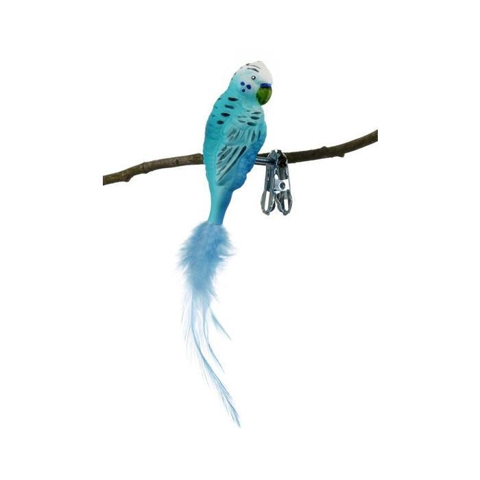 Blue budgerigar with clip. Detailed blue budgerigar with feather tail. The budgerigar measures 14 cm in height. The budgerigar is mouth blown and hand painted at the Glasbläserei Thüringer Weihnacht. Made of glass.