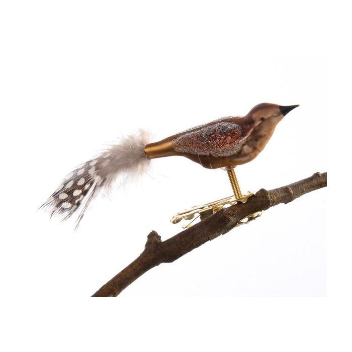 Bird with quail feathers and clip. Gold and bronze colored bird with beautiful quail feather tail and glitter on the wings. The bird measures 9 cm in length. It is mouth blown and hand painted at Glasbläserei Thüringer Weihnacht. Made of glass.
