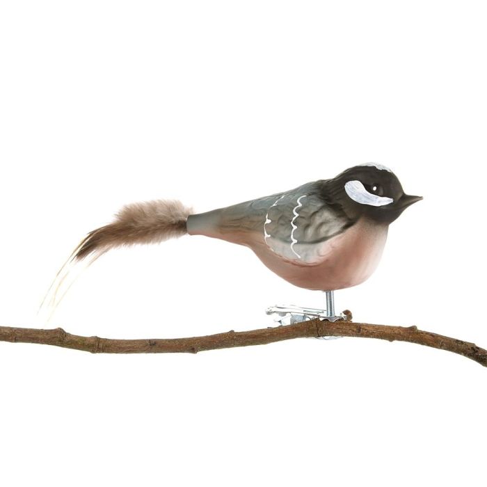 Coal tit with clip. The coal tit has a reddish chest and brown feather tail. The coal tit measures 15 cm in length. It is mouth blown and hand painted at Glasbläserei Thüringer Weihnacht. Made of glass.