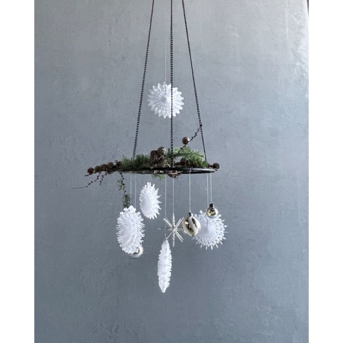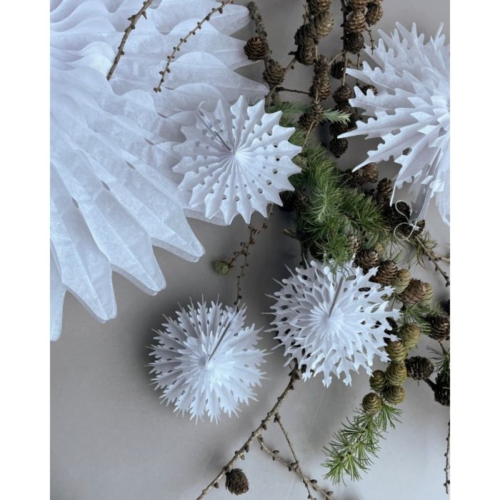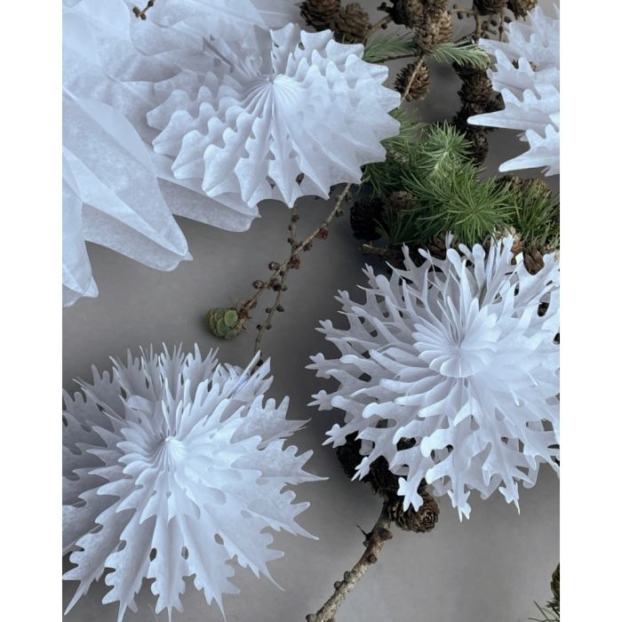 Handmade, decorative, white paper fans/paper decorations with a touch of winter's beautiful snowflakes on them from House Doctor. Decorate the window, the Christmas tree, the wreath from the ceiling or a branch, and let the fine paper decorations unfold in the most beautiful way.