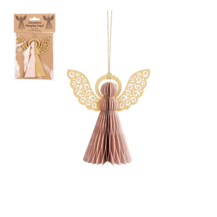 A trendy, handmade pink angel ornament with golden wings and halo made of paper. Hang it, for example, on branches, Christmas trees and windows. Available in several shapes and colours.