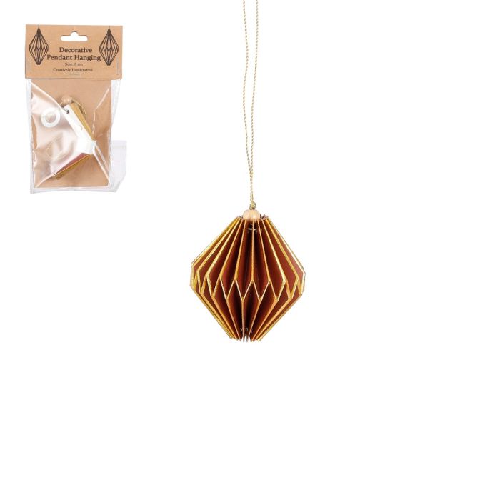 A decorative, handmade red bulb ornament with golden edges made of paper. Hang it, for example, on branches, Christmas trees and windows. Available in several shapes and colours.