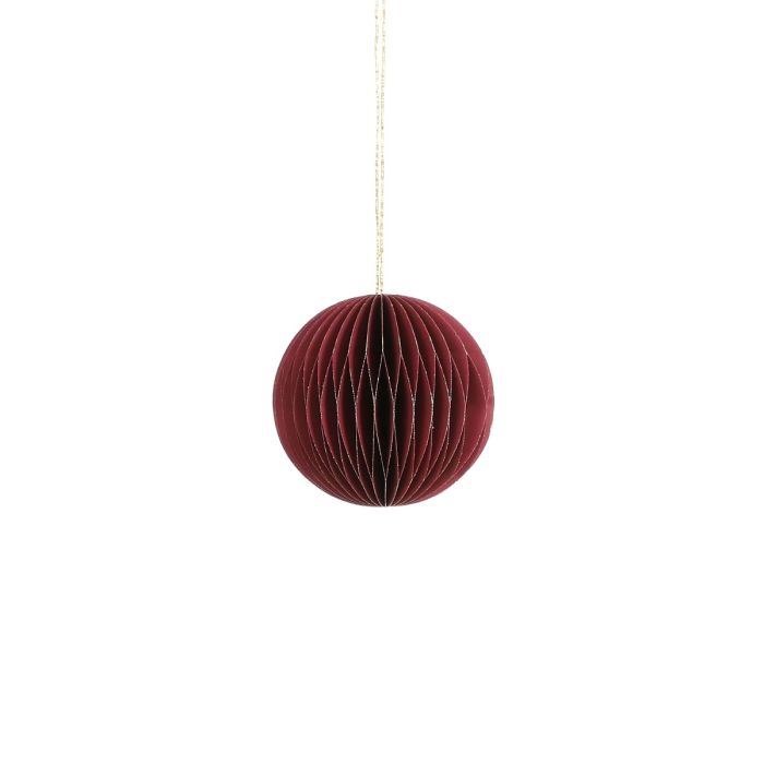 Red paper Christmas ball. The Christmas ball is made from recycled paper. It has a hanging string and a magnetic closure, so it can easily be assembled. Available in several shapes and colours.