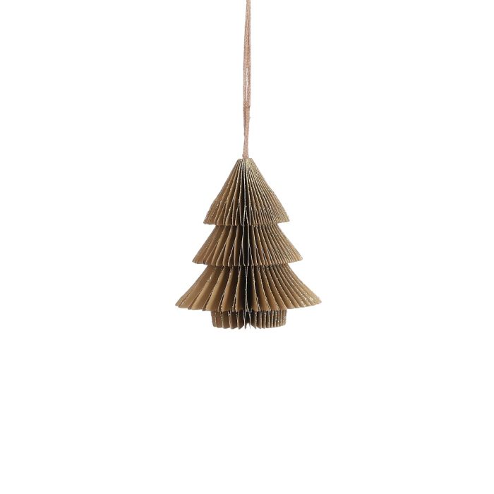 Golden paper Christmas tree with glitter on the edges. The Christmas tree is made from recycled paper. It has a hanging string and a magnetic closure, so it can easily be assembled. Available in several shapes and colours. Hang it, for example, on branches in a large vase or on a small window.