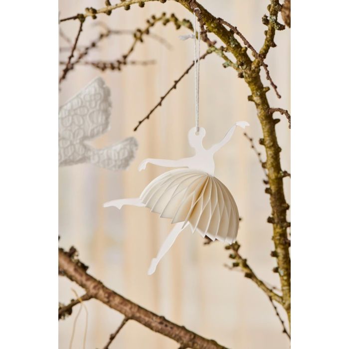 Elegant, dancing ballerina from Ib Laursen's Christmas collection. The ballerina has a folded paper skirt and is dancing in a beautiful position. There is a string for easy hanging. Can be hung on branches in a vase, on the Christmas tree, in the window or used lying down as a table decoration. The ballerina's skirt unfolds and closes with the help of a magnet. Available in different positions.