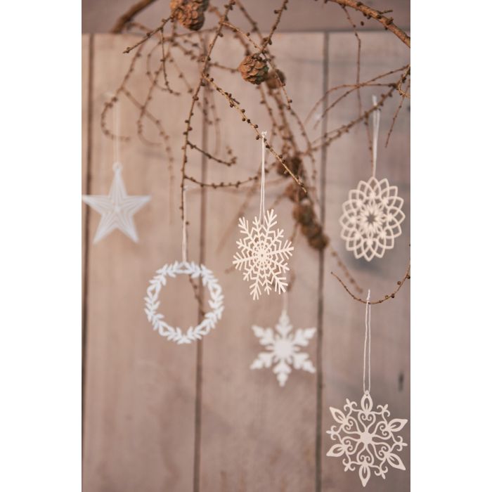 Fine, white snowflakes in thick paper from Speedtsberg. Decorate beautifully on Christmas and winter branches with their lightness and beautiful shapes. The package contains 2 pieces of each motif, 6 pieces in total.