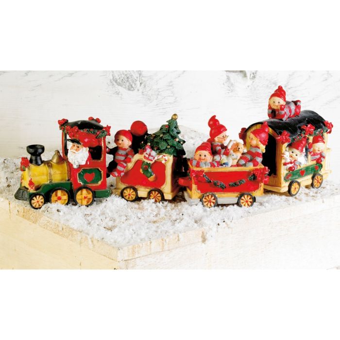 Baby elves on Christmas train. The Christmas train has a locomotive and three carriages. It measures 7 cm in height and is 38 cm long.