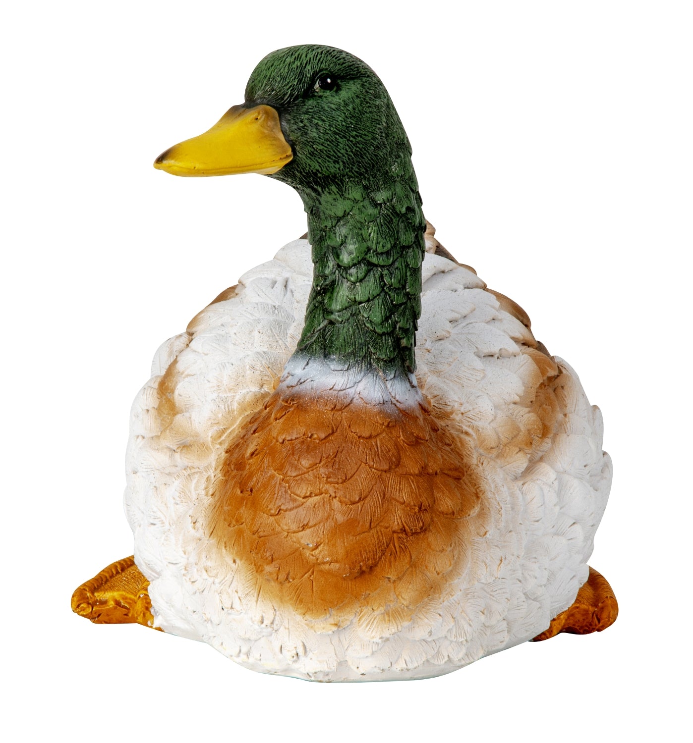 The duck is made of polyresin, which gives it a beautiful and detailed surface with a clear structure in the plumage. The warm brown and white shades combined with the characteristic green head and yellow beak give the figure a realistic and lively expression. It rests calmly with its body slightly lifted, as if it had just slid onto the bank.