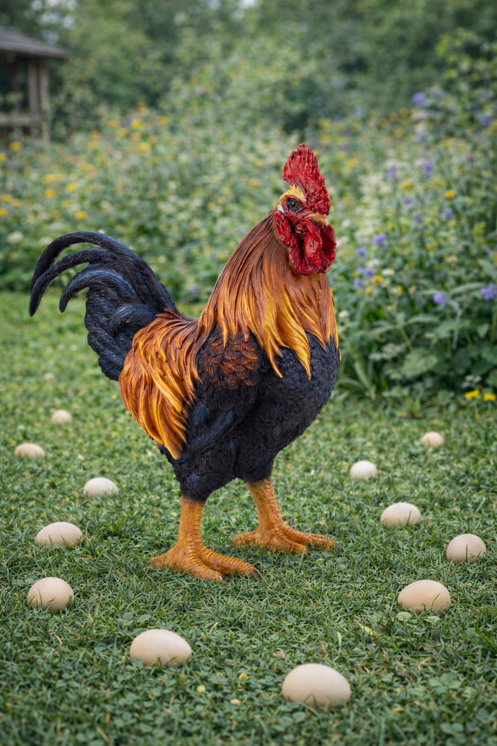 Lad påsken flytte ind i haven med denne flotte og detaljerede hane, der bringer landlig forårsstemning til både terrasse, indgangsparti og havebede. Med sine varme farver og stolte holdning ligner den en hane, der holder øje med forårets første påskeæg i græsset.