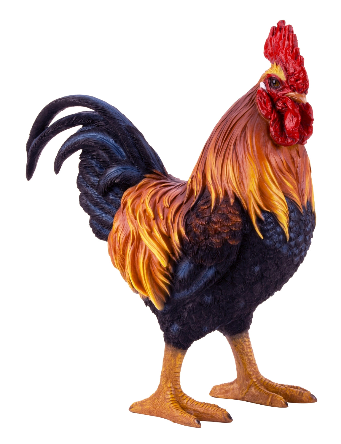 Hanens fjerdragt er smukt udført med dybe, mørke nuancer kombineret med gyldne og varme brunlige toner, som fanger lyset flot. Den røde kam og de fine detaljer i fjerene giver figuren et levende og naturtro udtryk. Fremstillet i polyresin fremstår overfladen ekstra detaljeret, så hver enkelt fjer og struktur træder tydeligt frem.