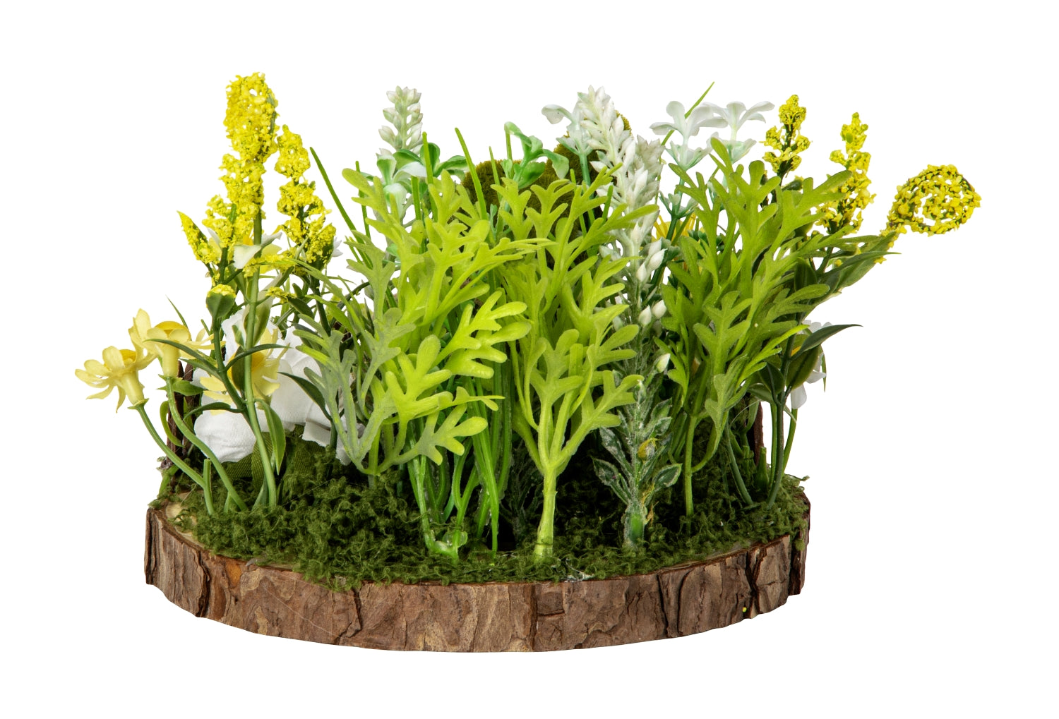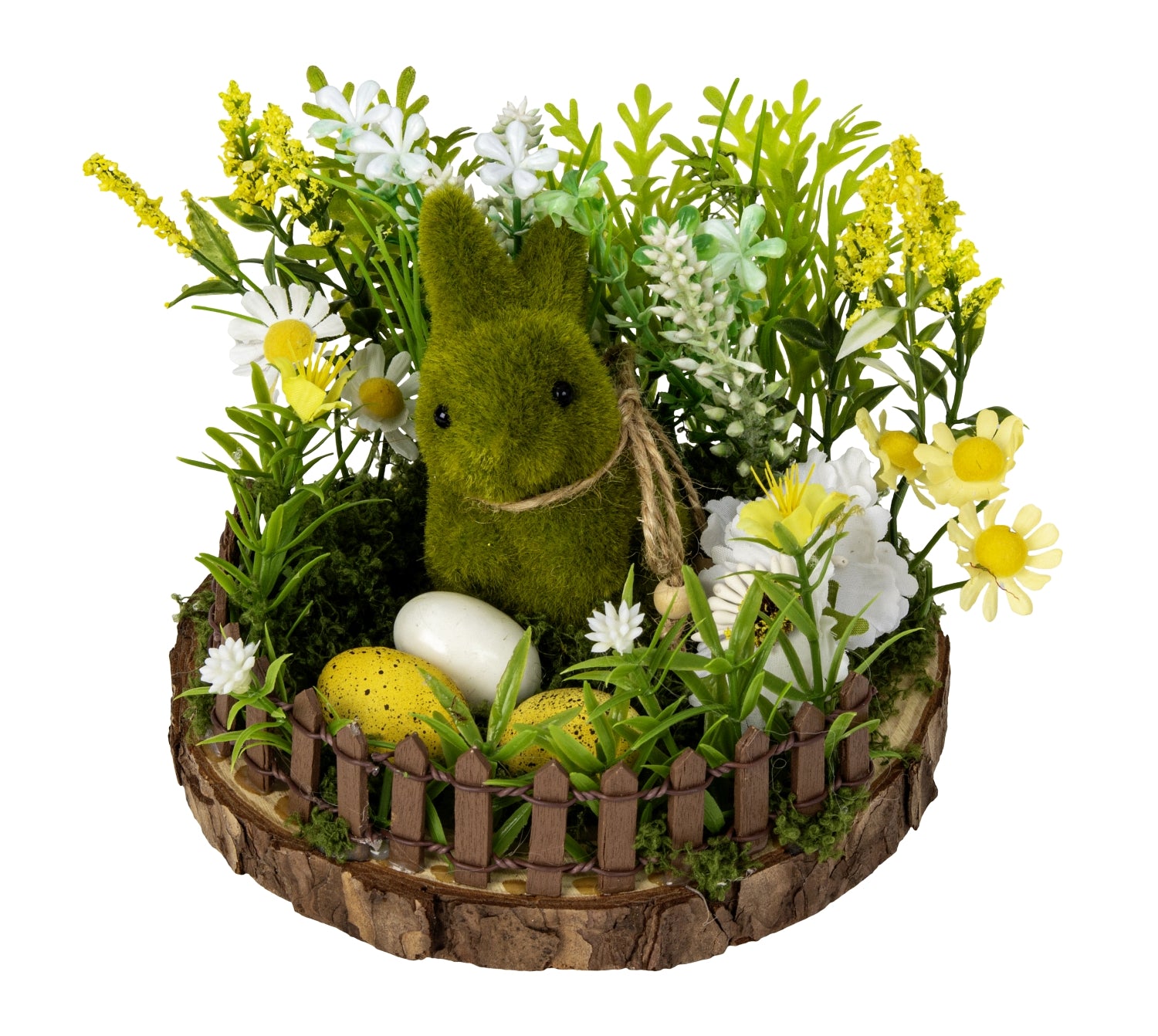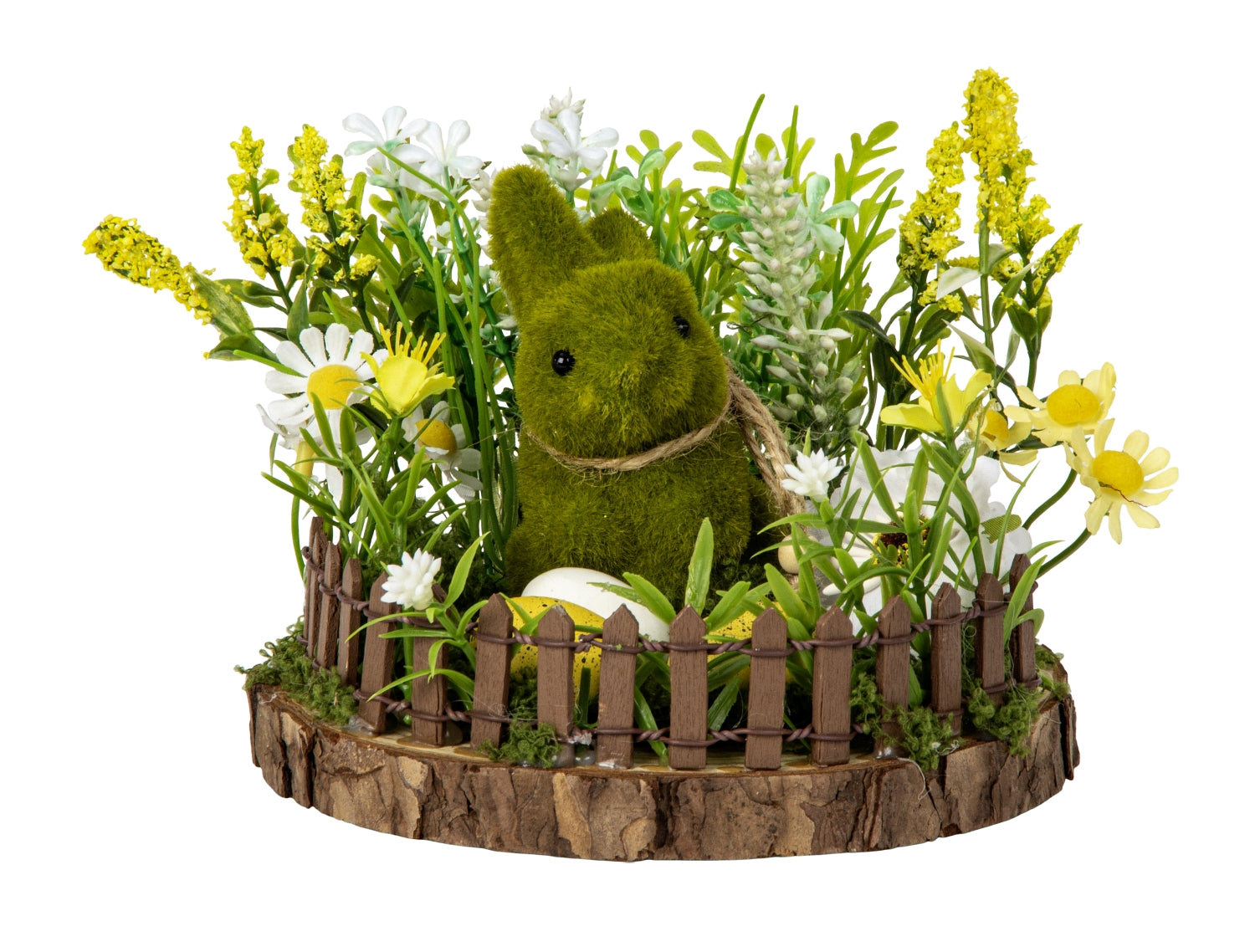 The moss green Easter bunny is surrounded by artificial flowers in the bright and cheerful colors of Easter, which bring life and a spring atmosphere to the arrangement. The small fence creates a cozy frame around the decoration and gives the impression of a miniature garden where the Easter bunny keeps an eye on his eggs. The combination of nature-inspired materials and colorful details makes the decoration suitable as a decoration on the Easter table, on the windowsill or on a shelf.