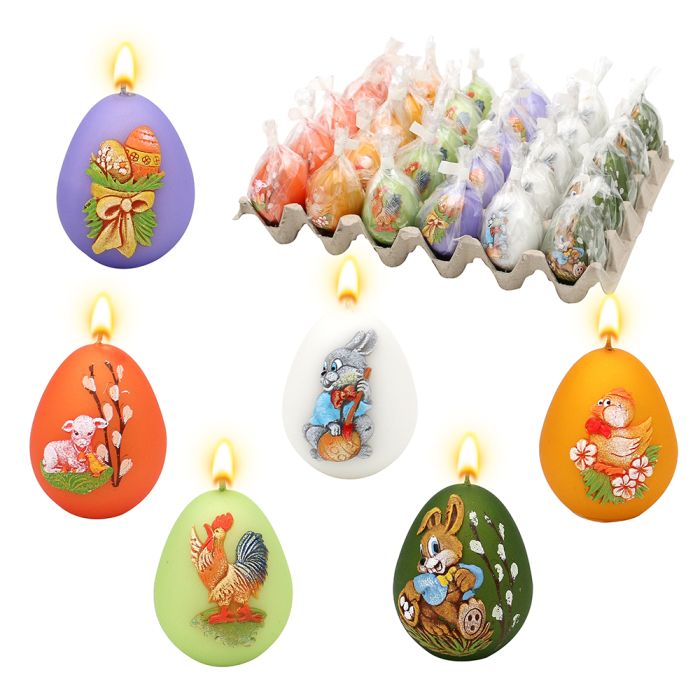 Candle with Easter motif. Available in 6 color variants and a different Easter motif. The candle measures 6 cm in height and have a diameter of 4 cm at their widest point.
