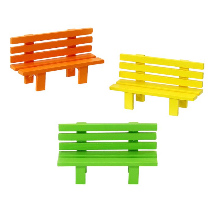 Wooden bench. Available in 3 variants: orange, yellow or green. For example, you can place figurines with hanging legs on the bench. The wooden bench measures 7 cm in height and 12.5 cm in length.