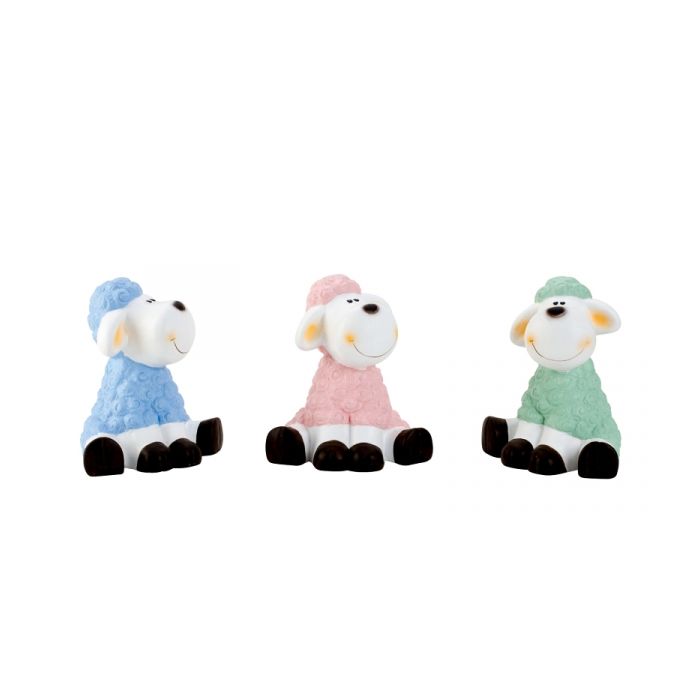 Sitting Easter lamb with beautiful pastel colours. Available in 3 variants: pink, mint green or light blue. The Easter lambs have happy faces and are sitting. It measures 19 in width and 20 cm in height.