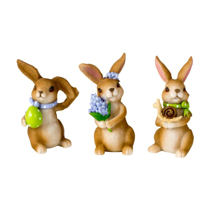 Easter bunny with fur texture on the body and spring items from the garden in its paws. The Easter bunny is available in three variants with different items in its paws. Choose between blue flowers, a snail, or a green Easter egg with white dots. The Easter bunnies are also available in two sizes.