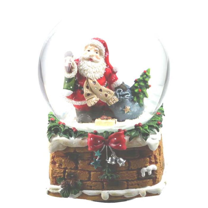 Santa Claus with scarf snow globe. They have been knitting a new, nice scarf for the cold winter at Santa Claus house. Inside the ball, there stands Santa Claus wearing the scarf with the gift bag ready. The lower part of the ball is decorated with fir garlands and a large bow. The bottom is decorated like a brick wall with snow. When the mechanical music box is switched on, the Christmas melody "O come all ye faithful" is played. The ball measures 14.5 cm in height and the snow ball has a diameter of 10 cm.