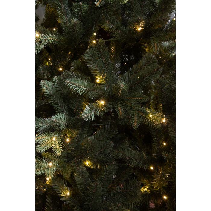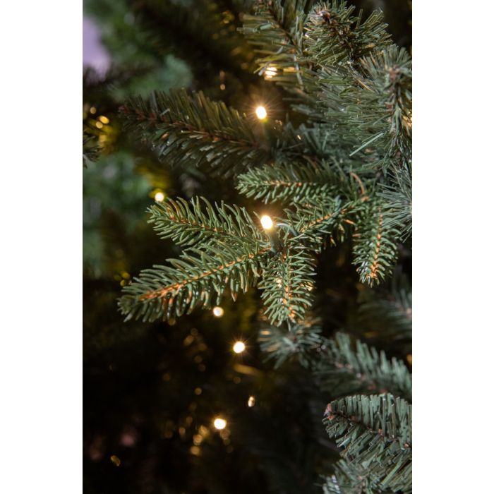 Elkins high quality artificial Christmas tree from Black Box. The Elkin series stands for life-like Christmas trees produced using a mixture of PVC and PE, which makes the needles appear very natural. The tree has a triangular shape and small branches that stick out a little further than the outline. The tree has numerous branches with thick needles and is decorated with 200 LED lights. Available in several sizes with or without lights.