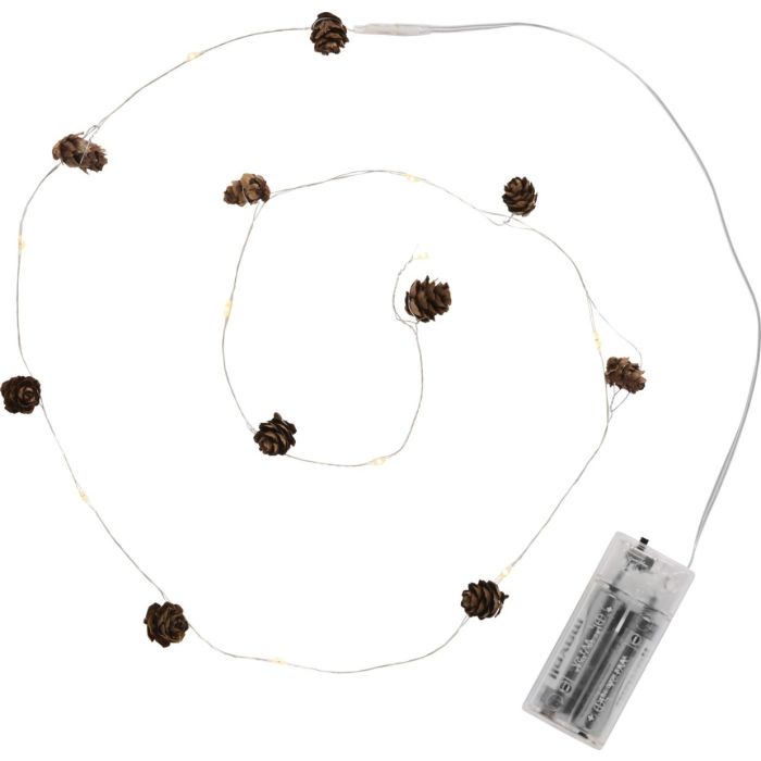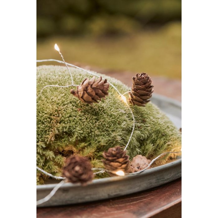 Cozy and decorative light chain from Ib Laursen. The chain has 10 small LED lights and small natural pine cones, which give an atmospheric and rustic look. It fits perfectly with both autumn and winter decorations and is ideal as part of Christmas decorations on the table, on the windowsill or in a wreath. Use it to highlight natural materials in your decorations, or let it light up beautifully in a lantern, on a tray with fir and candles or as part of your Advent decorations.