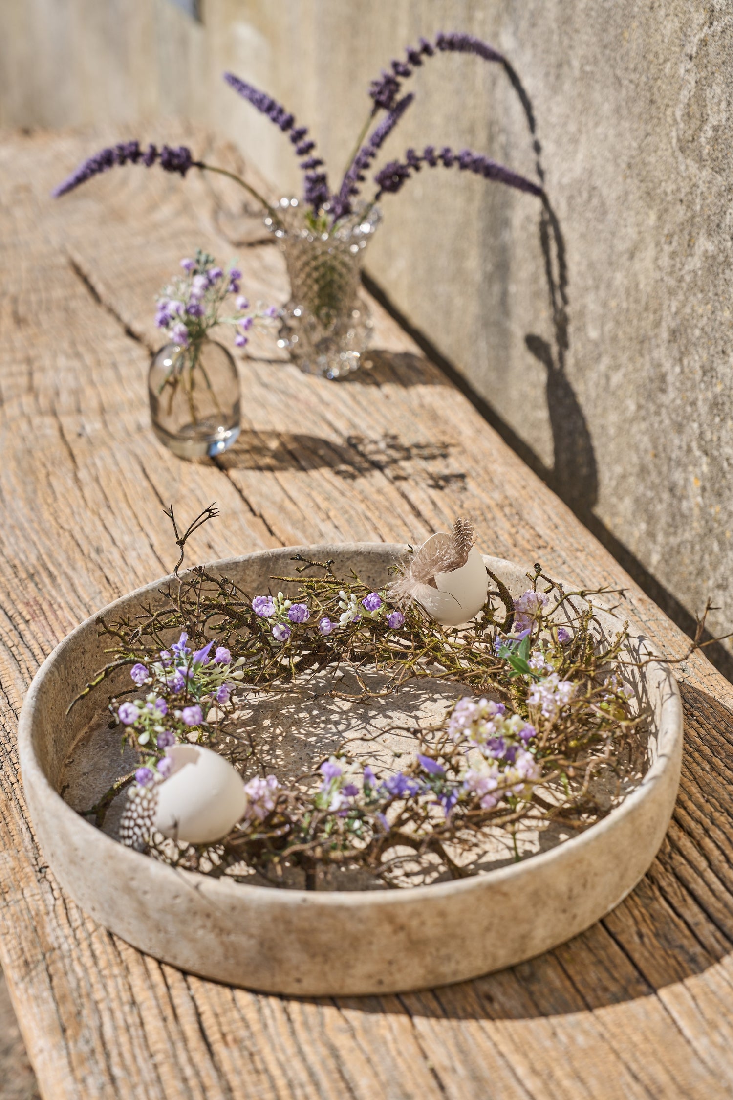 De kan bruges på mange forskellige måder i hjemmets forårsdekorationer. Fjerene kan bindes på grene i en vase, lægges i en krans, placeres i små borddekorationer eller bruges sammen med æg og blomster i en større påskeopstilling.