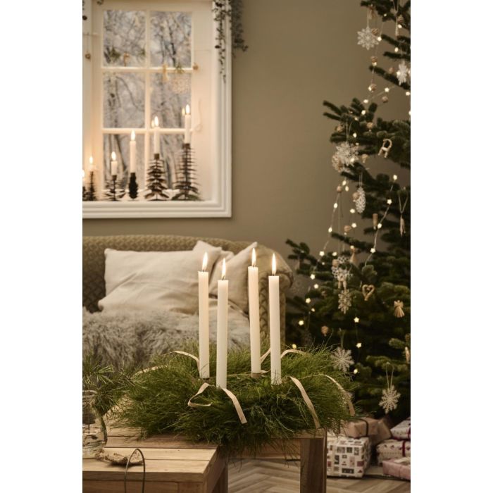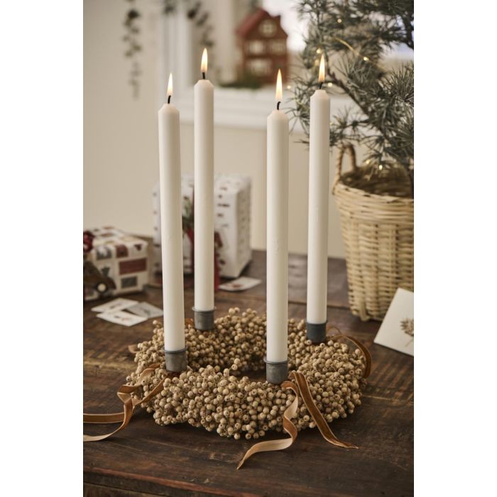 Set of elegant white Advent candles from Ib Laursen. In the box you will find four classic candle wax crown candles, each with an embossed number from 1–4, so you can easily count the Sundays until Christmas in the traditional way. The Advent candles fit both Advent candles and Advent wreaths and can be combined with fir, pine cones and other Christmas decorations for an atmospheric expression. The Advent candles are available in several colors and are Nordic Ecolabeled.