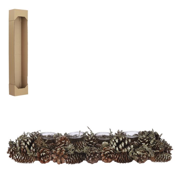 Brown oblong advent wreath with lots of pine cones and 4 glass tealight candle holders. Measurements: L: 54.5 cm D: 16.5 cm H: 9 cm.