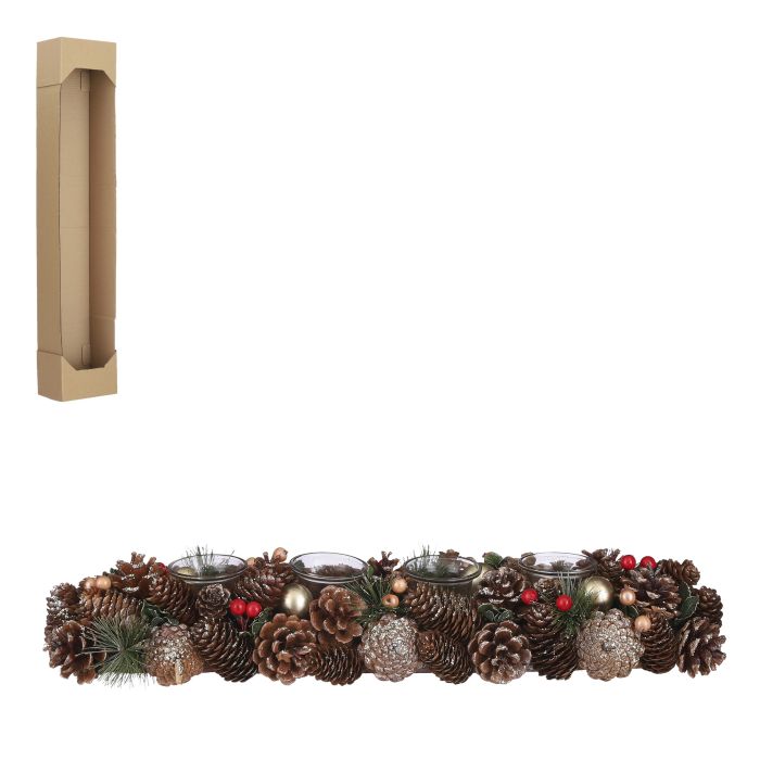 Beautiful oblong Advent wreath with lots of pine cones, red berries, glitter and 4 glass tealight candle holders. Measurements: L: 54 cm D: 15 cm H: 9 cm.