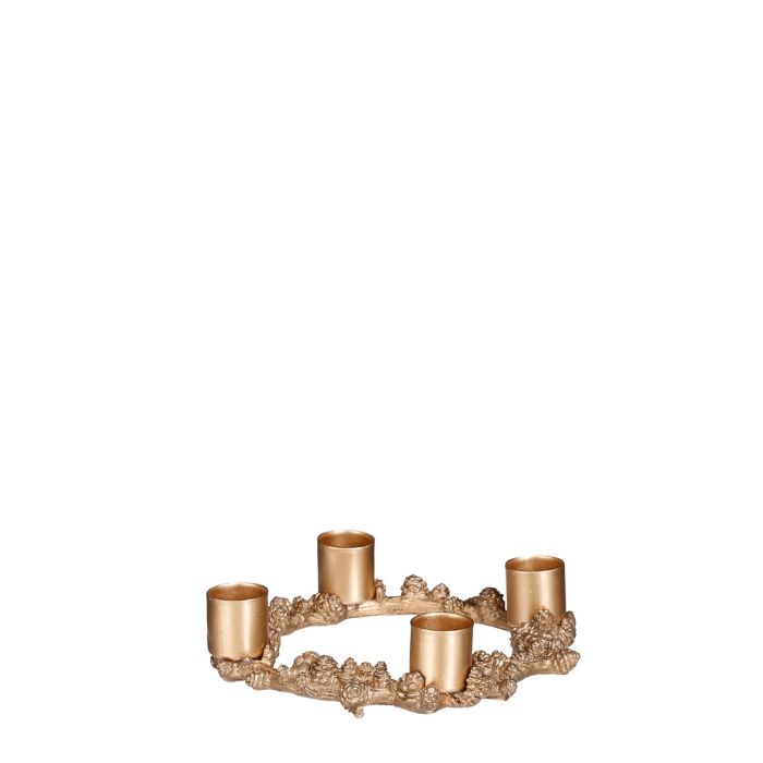 Golden Advent candle holder shaped like a round branch with small cones on it. Use it as a decoration for Christmas or for autumn / winter season.