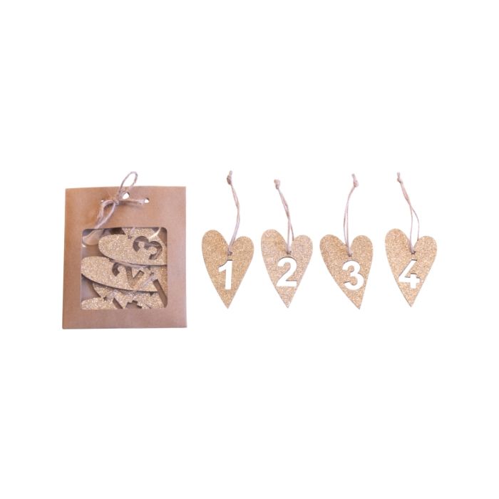 Beautiful hearts carved in wood with the numbers 1 - 4 in the middle. The hearts are decorated with gold glitter and string, ready to decorate gifts on the four Sundays of Advent.
