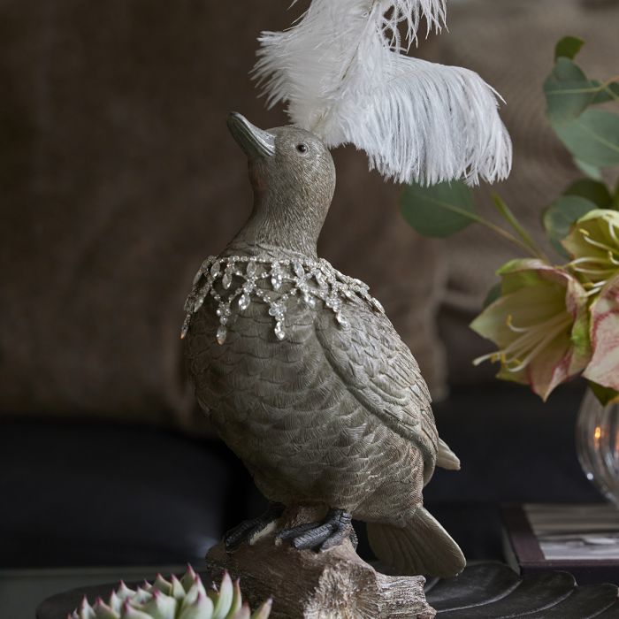 With white feathers on its head, a sparkling necklace around its neck and a curious look, this golden-colored duck invites itself in. The duck is part of Speedtsberg's series of home decor items. A great eye-catcher in your home decor.