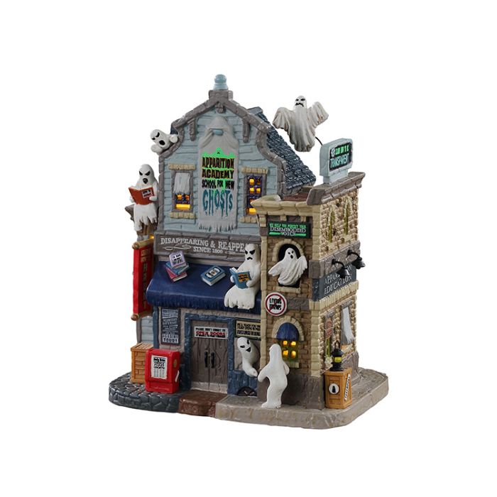 Apparition academy. Facade with reading ghosts in the corners. Horror is studied here. It uses a 4.5 V adapter, which is included.