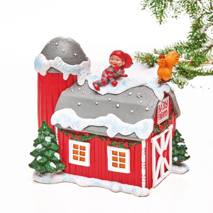 Der er pyntet op til jul hos Babynisserne på den rødmalede bondegård.