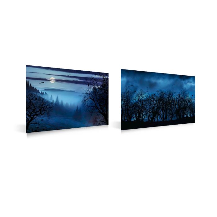 The dark forest background is double sided and has 2 nice gloomy scenes. The background is suitable for Halloween and is made of hard plastic. Measurements: L: 59 cm x H: 39 cm.