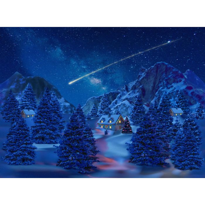 Canvas backdrop with lighted falling star effect. It is printed directly on a canvas.Use it as a picture or backdrop for your miniature Christmas landscape. The LED light gives the falling star a stuning effect.