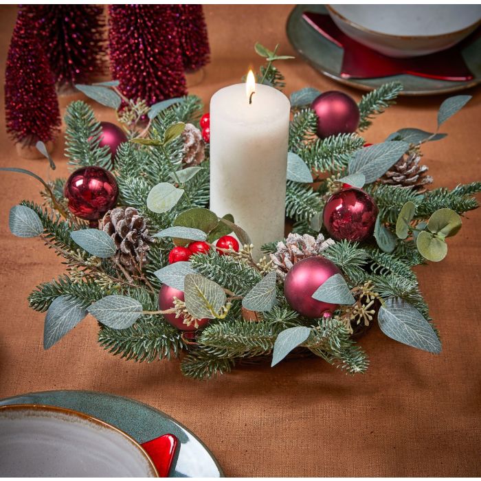 Benton artificial fir wreath with berries, shiny and matte red Christmas balls and decorative leaves. Hang it on the door or add a calendar candle and use it as an Advent wreath. A very beautiful and durable wreath.