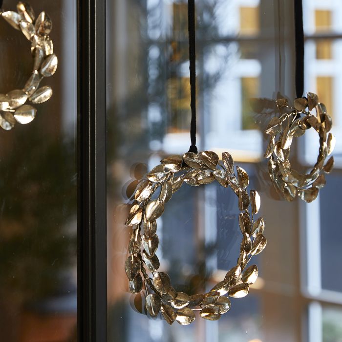 Beautiful metal leaf wreath from Speedtsberg in antique gold. Decorative, for example, hanging as a window decoration, on the Christmas tree or lying as a table decoration. The leaf wreath is also available in a larger version and as a ball.