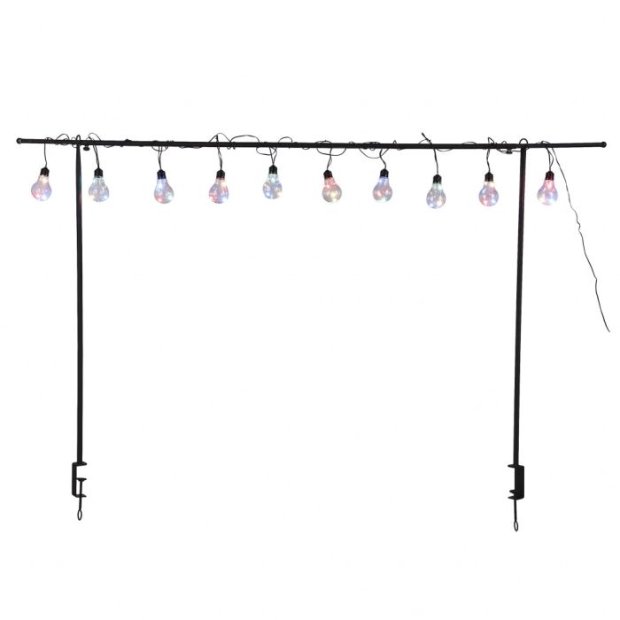 Black painted metal table stand with light chain for outdoor use. Extend the summer evenings with cozy lighting. You can hang decorations around the light bulbs. The table stand can easily be set at the ends of the table and it can be adjusted from 100 cm to 250 cm. The height can also be adjusted from 90 cm to 130 cm. The light chain has 10 multi-coloured LED bulbs. The light chain is solar powered. It also has a battery box.