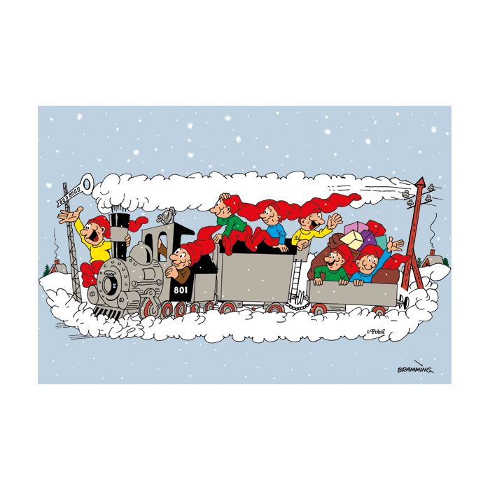 Pakke med 4 stk. dækkeservietter med Brammingnisser i tog som motiv. Baggrunden er gråblå med små, hvide stjerner og snefnug. Dækkeservietterne måler 29 cm x 43 cm. Dækkeservietterne er vinylbelagte.