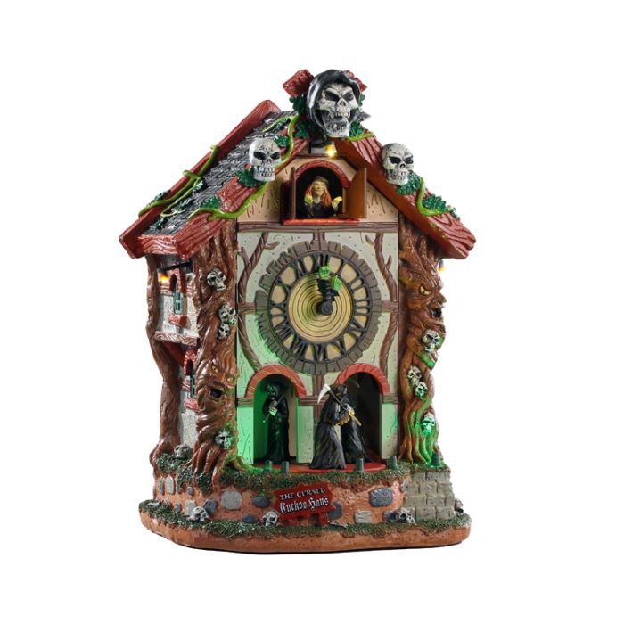 The cursed cuckoo haus. When the clock strikes 12 o'clock, the apparitions come out of it and frighten the villagers. It uses a 4.5 V adapter, which is included. It belongs to the Spooky Town series.