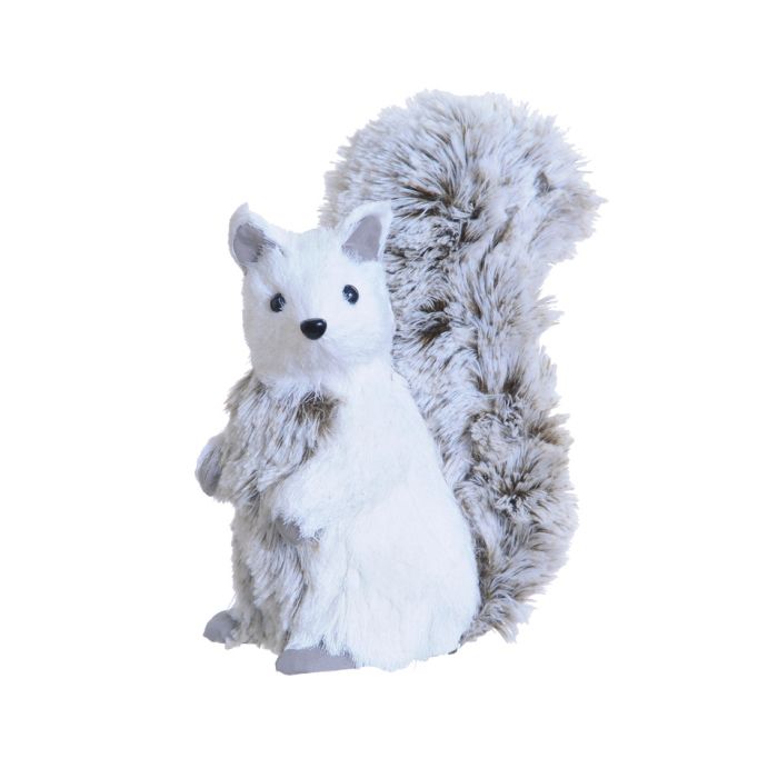White squirrel with soft tail. The little winter squirrel has spotted something and sits on guard with a big, shaggy tail. The squirrel measures 24 cm in height. Made of styrofoam and faux fur.