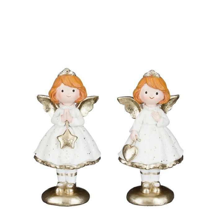 Fine and atmospheric angel figures. The angels are dressed in white dresses with gold-colored details, elegant tiaras and fine angel wings. They have happy and lively faces that spread warmth and joy. Each angel holds either a heart or a star in their hand, as symbols of love and light during the Christmas season. They are beautiful as decorations on the Christmas table, on the windowsill or on a shelf, where they can create coziness and a traditional Christmas atmosphere.