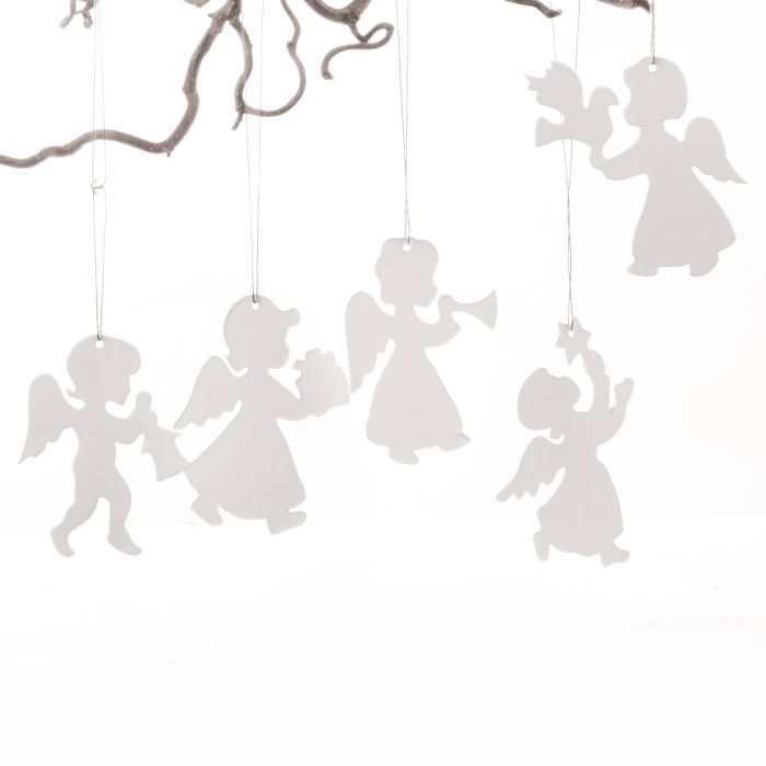 Cardboard angels. White cardboard carved angels with white hanging thread. The angels have a height of about 6 cm. 10 pieces per bag.