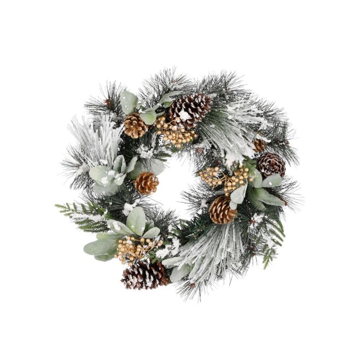 Etienne flocked wreath. The wreath is made of artificial fir, various types of cones, golden berries and dusty green leaf sprigs.