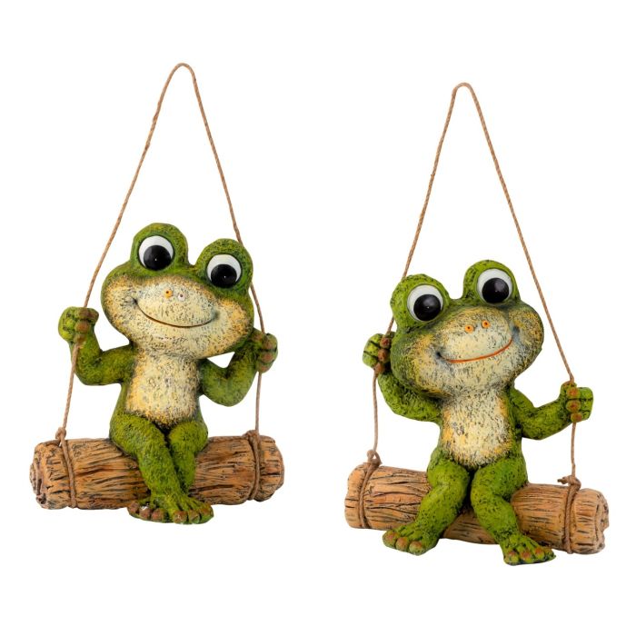 Green frog sitting on a tree trunk swing. Fun and decorative in the garden's trees and bushes. Made of robust material that can withstand night frost.