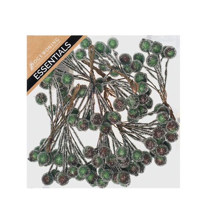 Flocked dark green berries with wire. Flocked dark green berries with a small metal wire to stick into the wreath, clay, ground, etc. There are 10 clusters of 12 berries each per bag. Made of styrofoam, glass beads and metal.