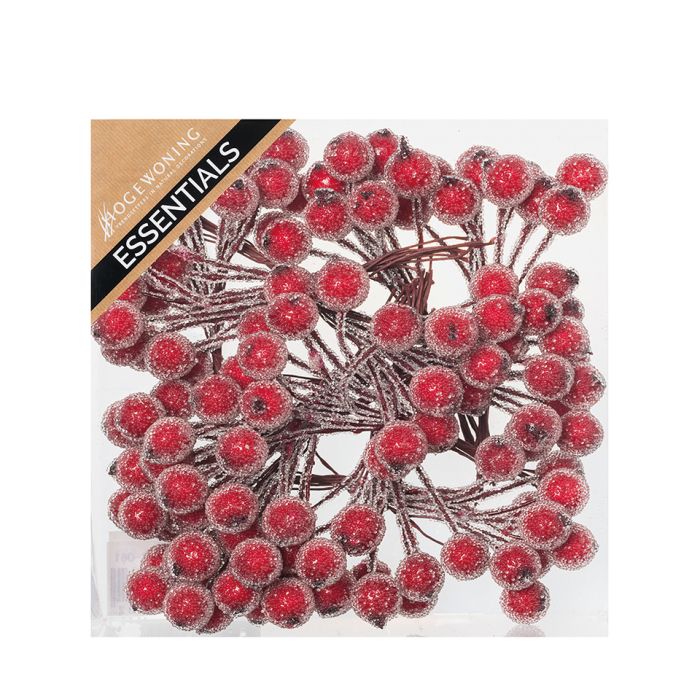Flocked red berries with wire. Small, flocked, red berries with a small metal wire to stick into the wreath, clay, ground, etc. There are 12 clusters of 10 berries each per bag. Made of styrofoam, glass beads and metal.