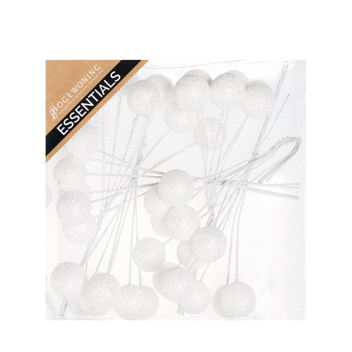 White glitter balls with wire. Round decorative balls with a 13 cm long wire. There are 6 clusters of 6 glitter balls each per bag - a total of 36 pieces. Made of styrofoam, iron and mica.